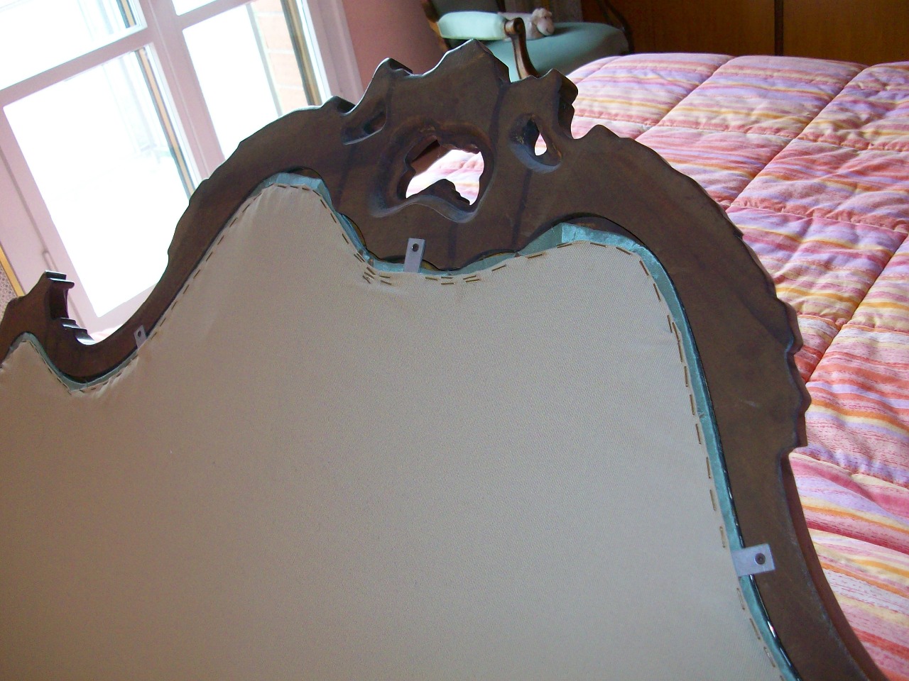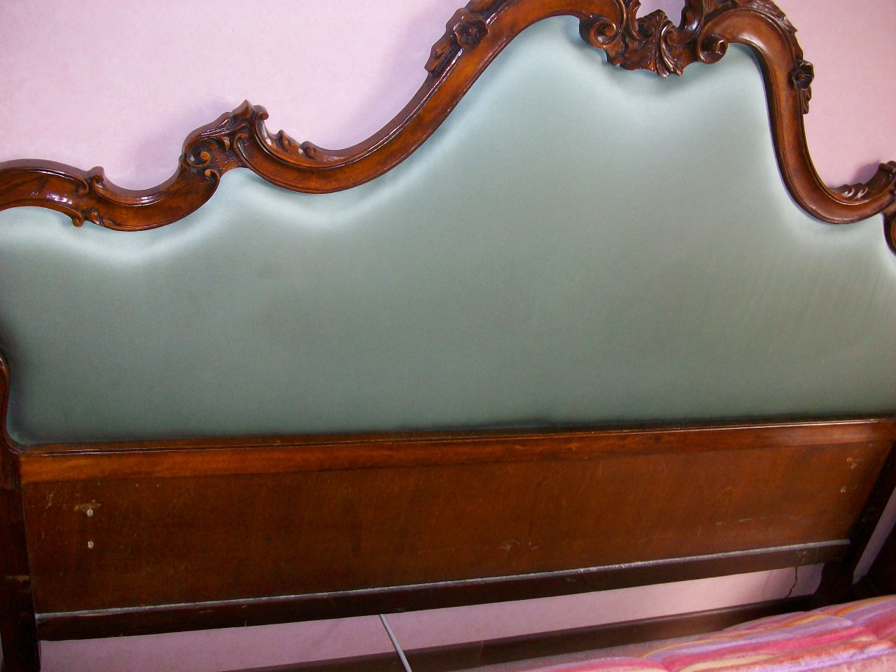 Testata letto matrimoniale con rivestimento color verde brillante, lavorazione ed intarsi